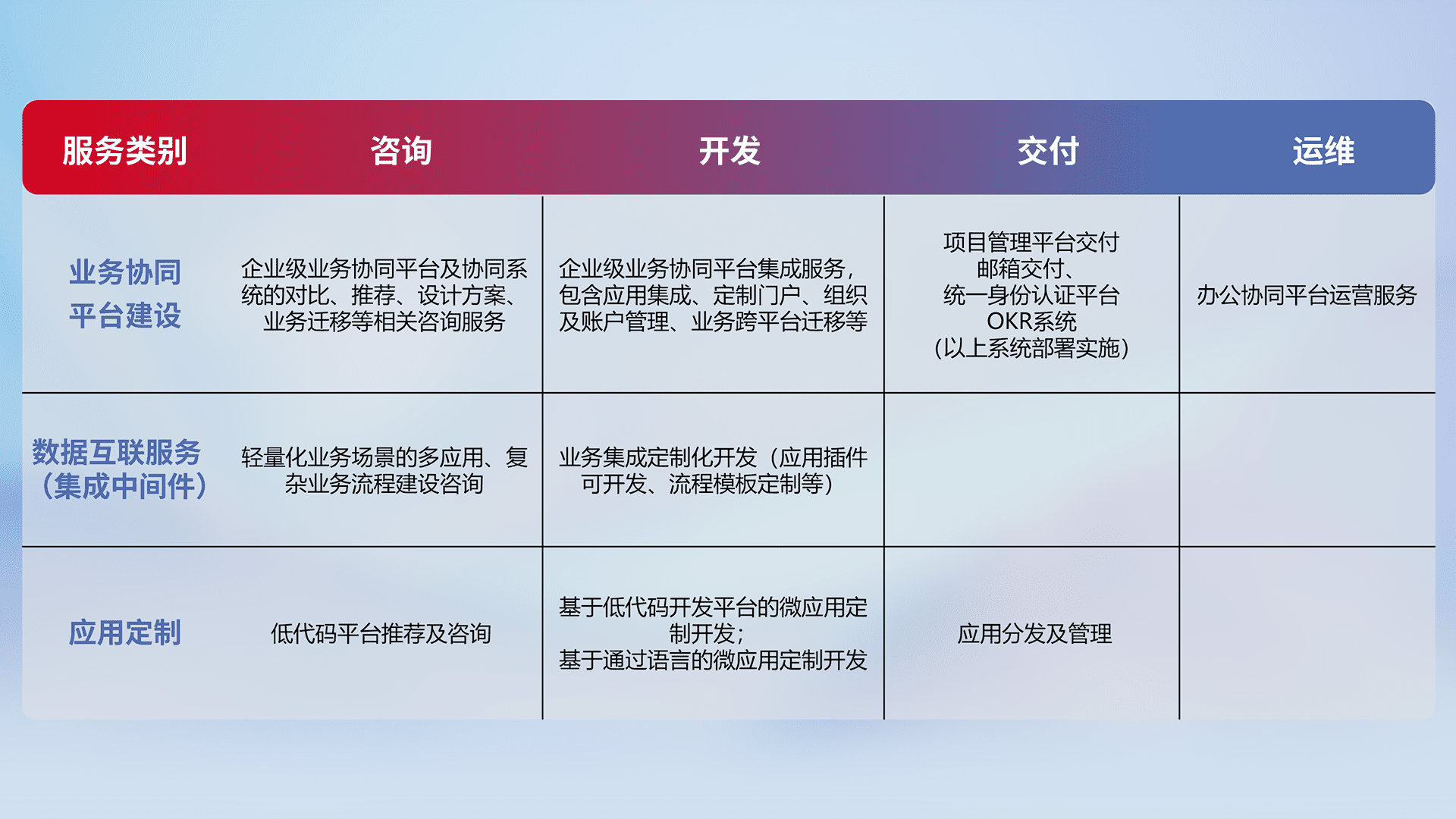 针对钉钉、、企微、、IDaas等平台级产品提供产品的规划、、、方案、、、交付、、定制化开发等服务,,实现如统一协同办公、、、、智能客户服务、、、、混合会议管理、、、智能数据查询、、、、等业务场景,,,实现数字化转型。。。